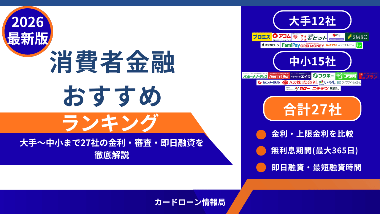 本記事では安全性、スピード、プライバシー、審査通過率、コストの5つの基準で消費者金融を確認し、大手12社、中小15社の合計27社を徹底比較しました。本サイトで特におすすめする消費者金融は最短で融資してくれて、長期的に無理なく返済できるように無利息期間を設定してくれる業社です。