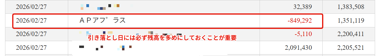 これが1番重要です!1日の遅れでも社内情報として記録される可能性はあります。基本的にクレジットカードは引き落としになるため、こういう残高不足を防ぐため、引き落とし日前には口座に残高があるのか必ず確認しましょう。